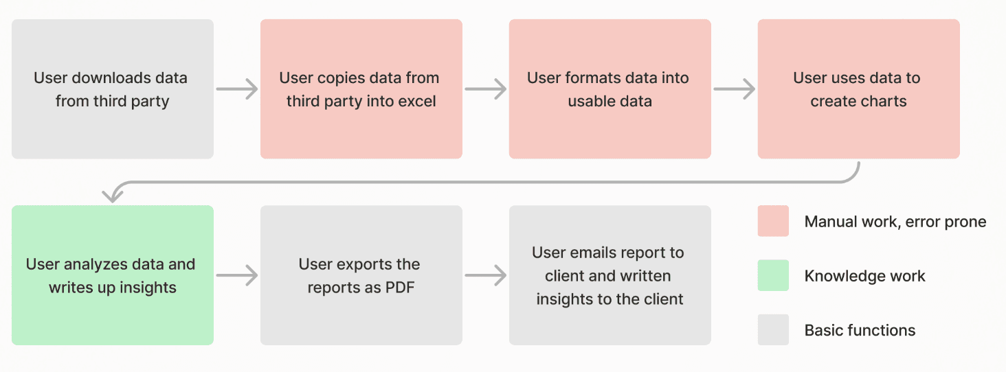 Through interviewing users, I found that the internal reporting process for performance marketing involved manual data entry into excel, had to be completed by the first of each month and could take up to a full work day to complete.